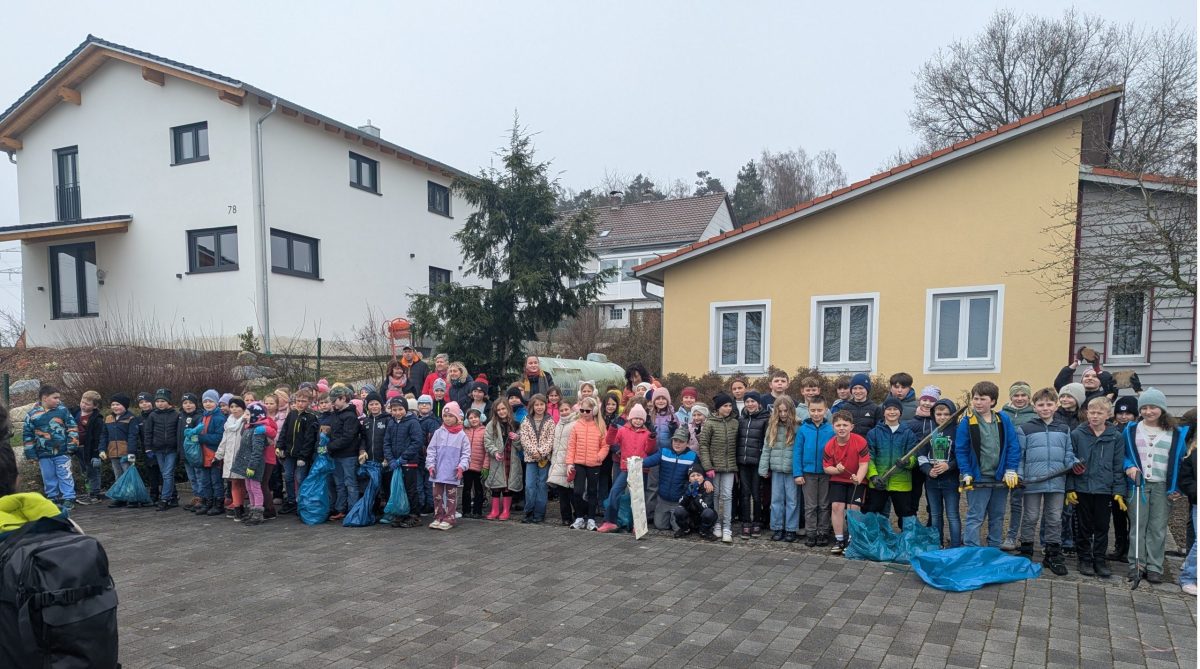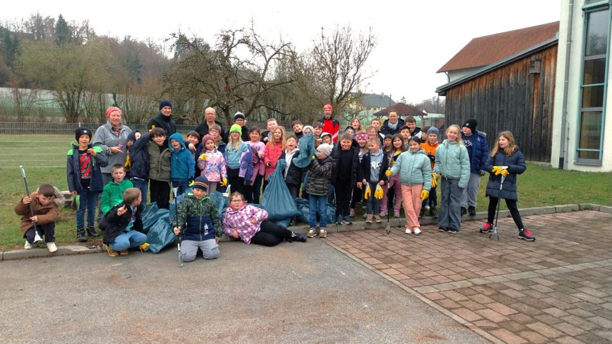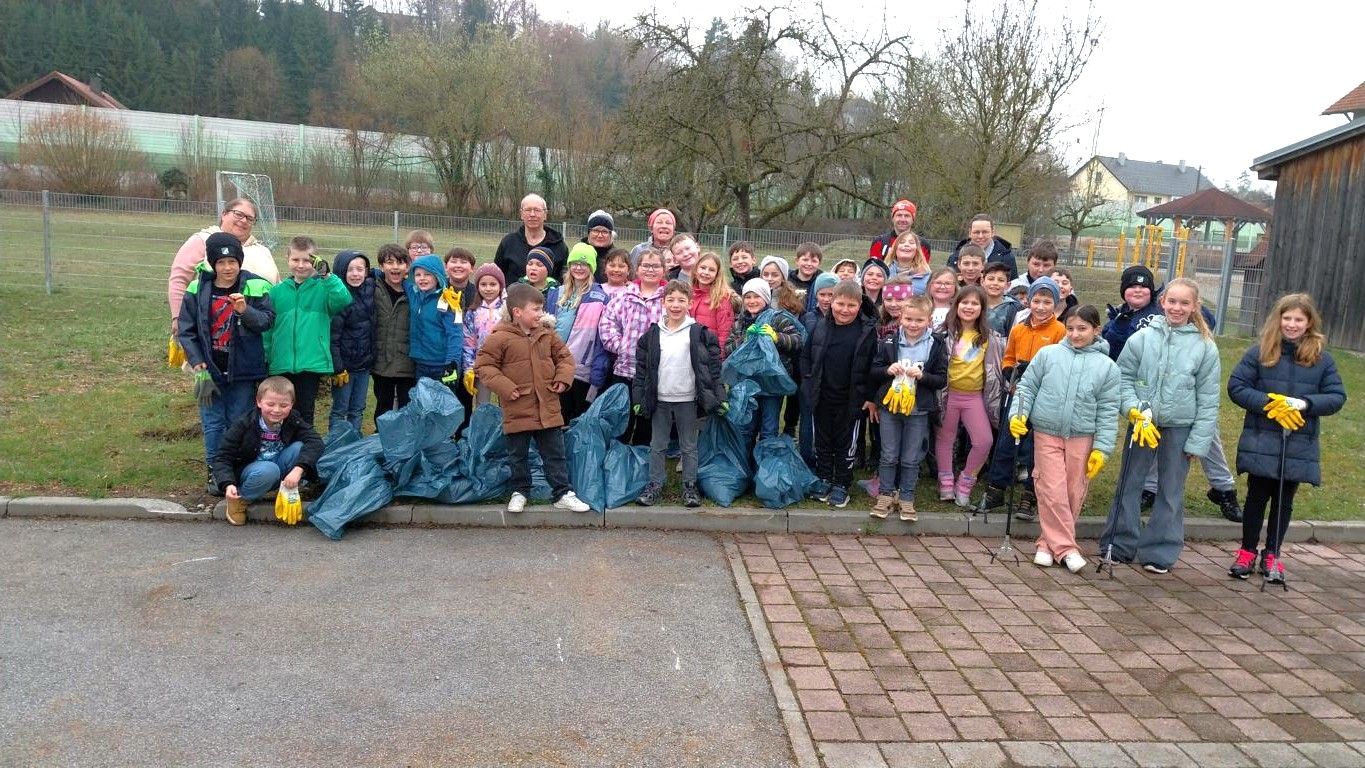 Alle Kinder der Grundschule Alkofen-Pleinting präsentieren ihren in vollen Säcken gesammelten Müll